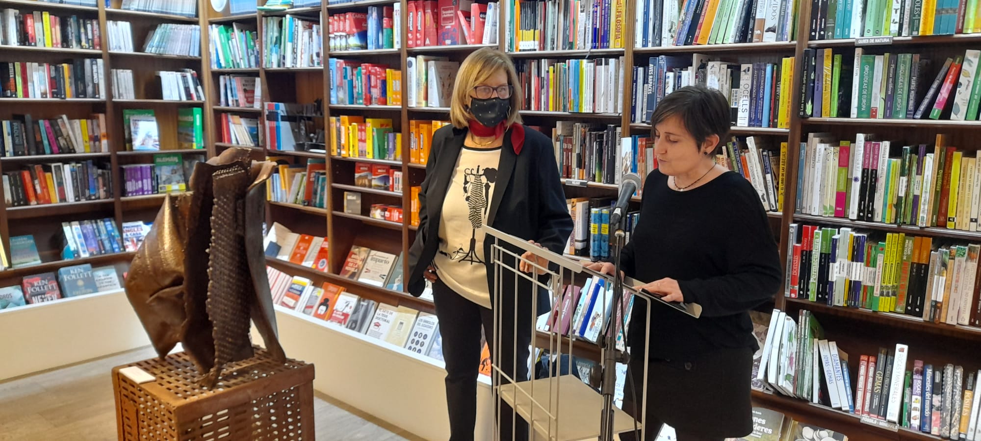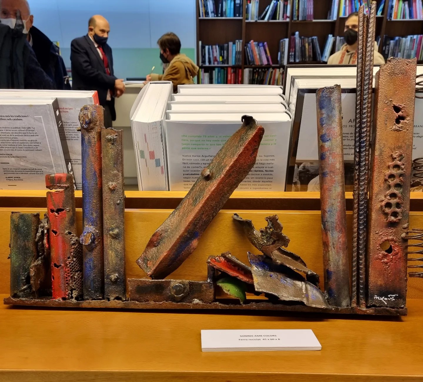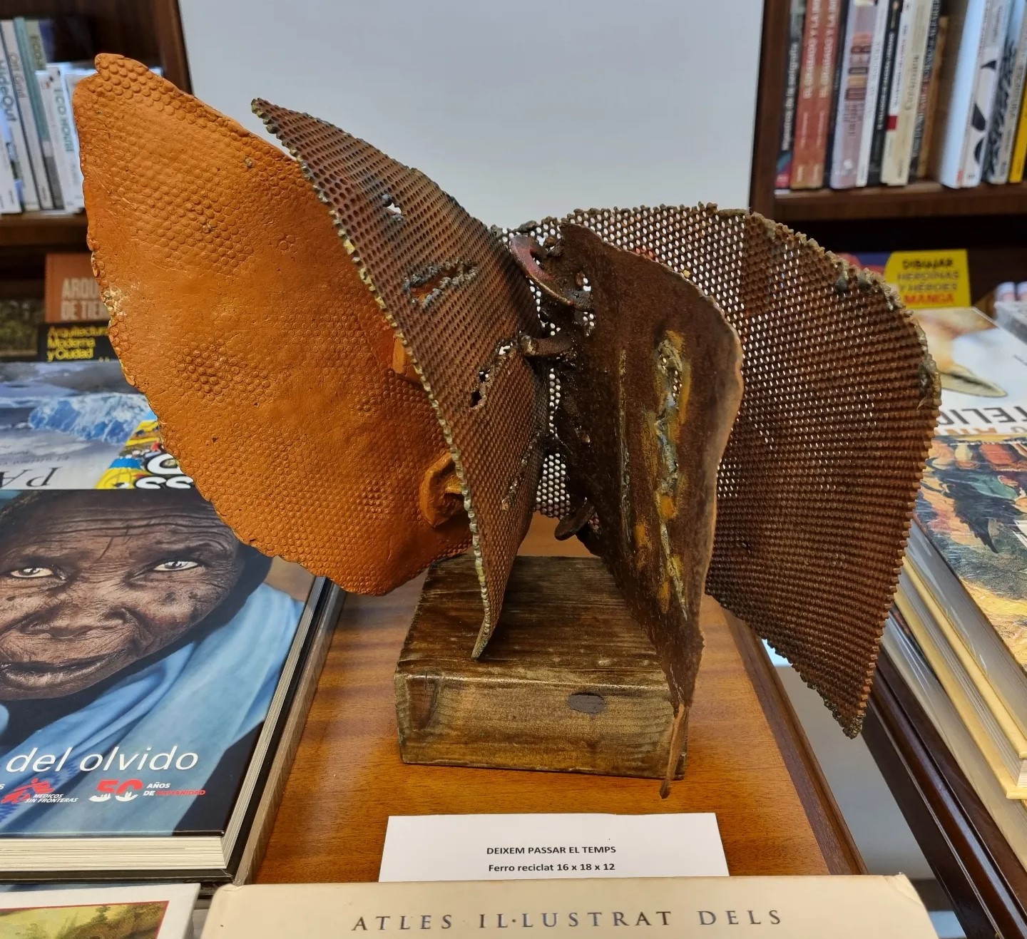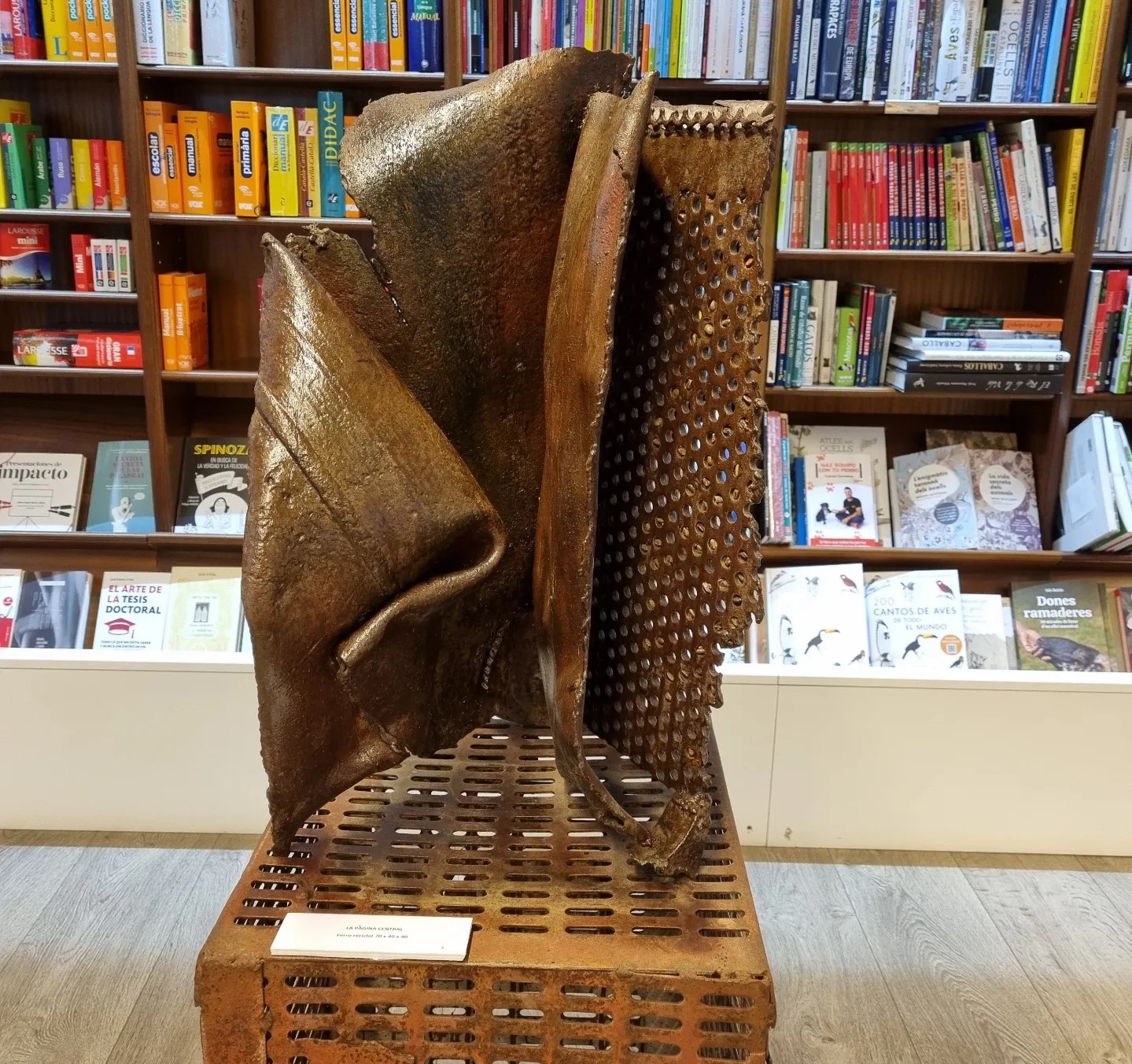 Ahir vam celebrar la inauguració de l’exposició de l’Àngels Freixanet, amb peces creades a partir de ferro reciclat i fusta. Figures artístiques envoltades de llibres, que, a la vegada, també ho són.