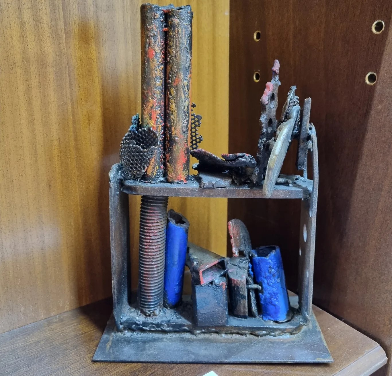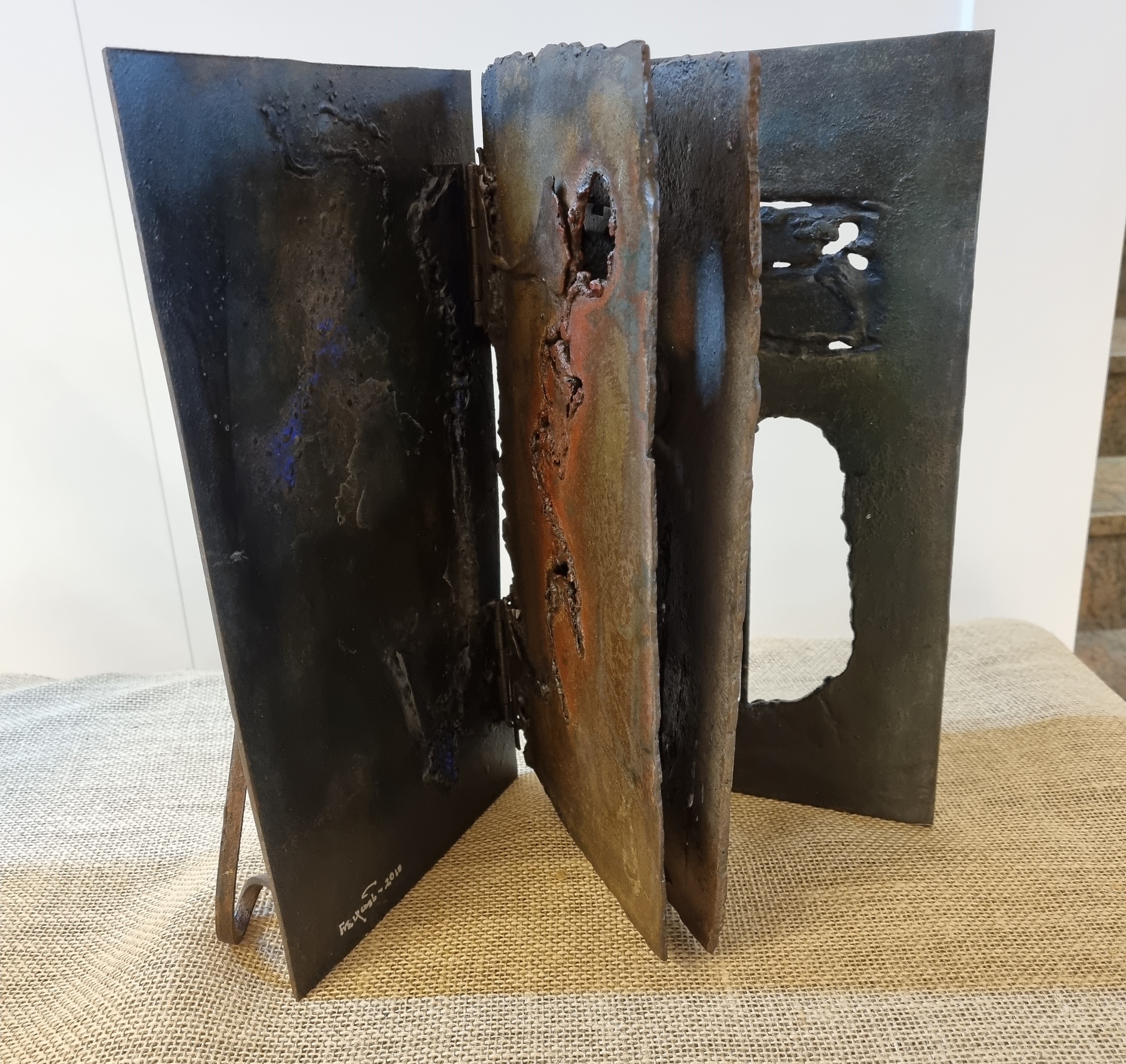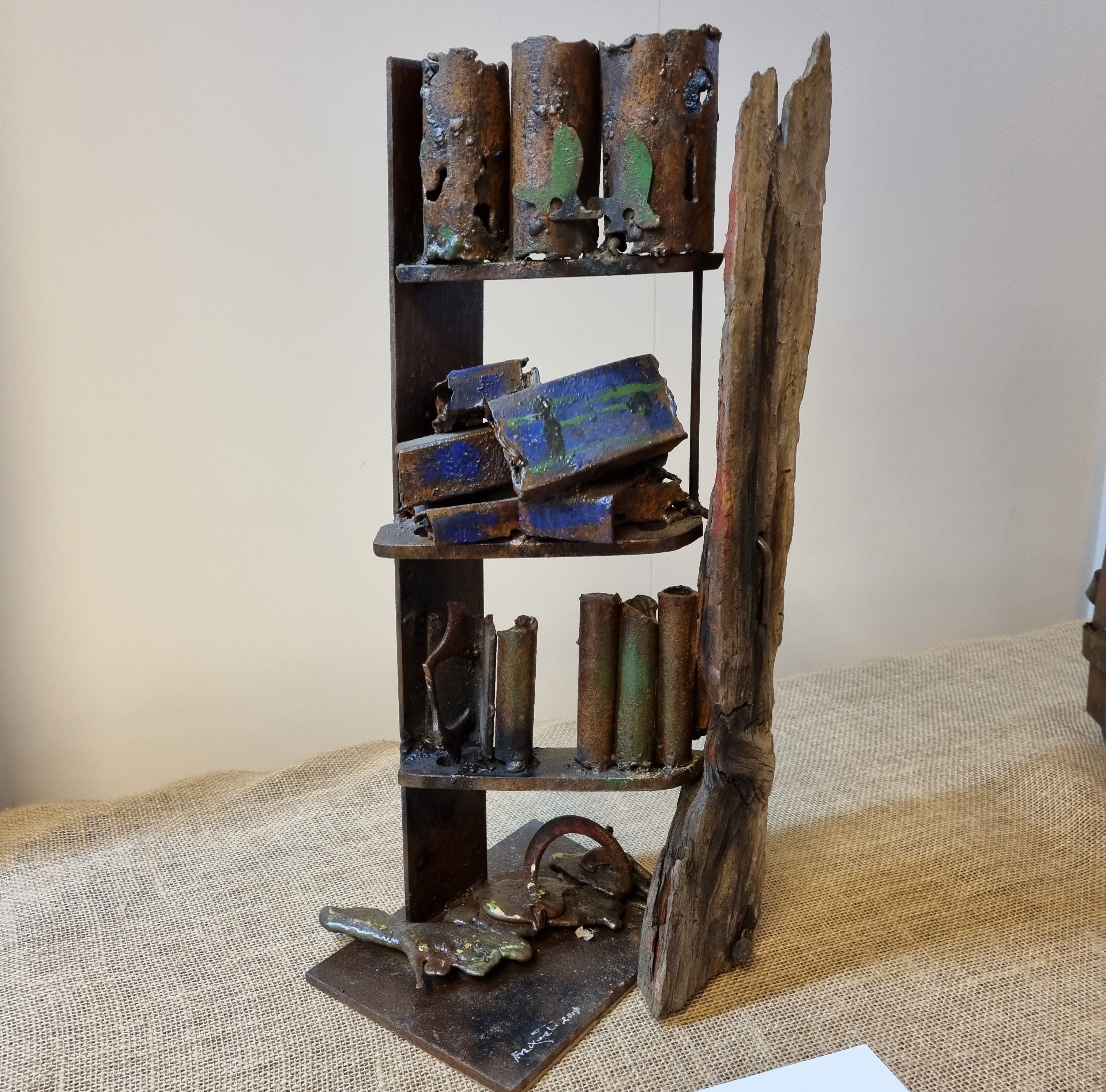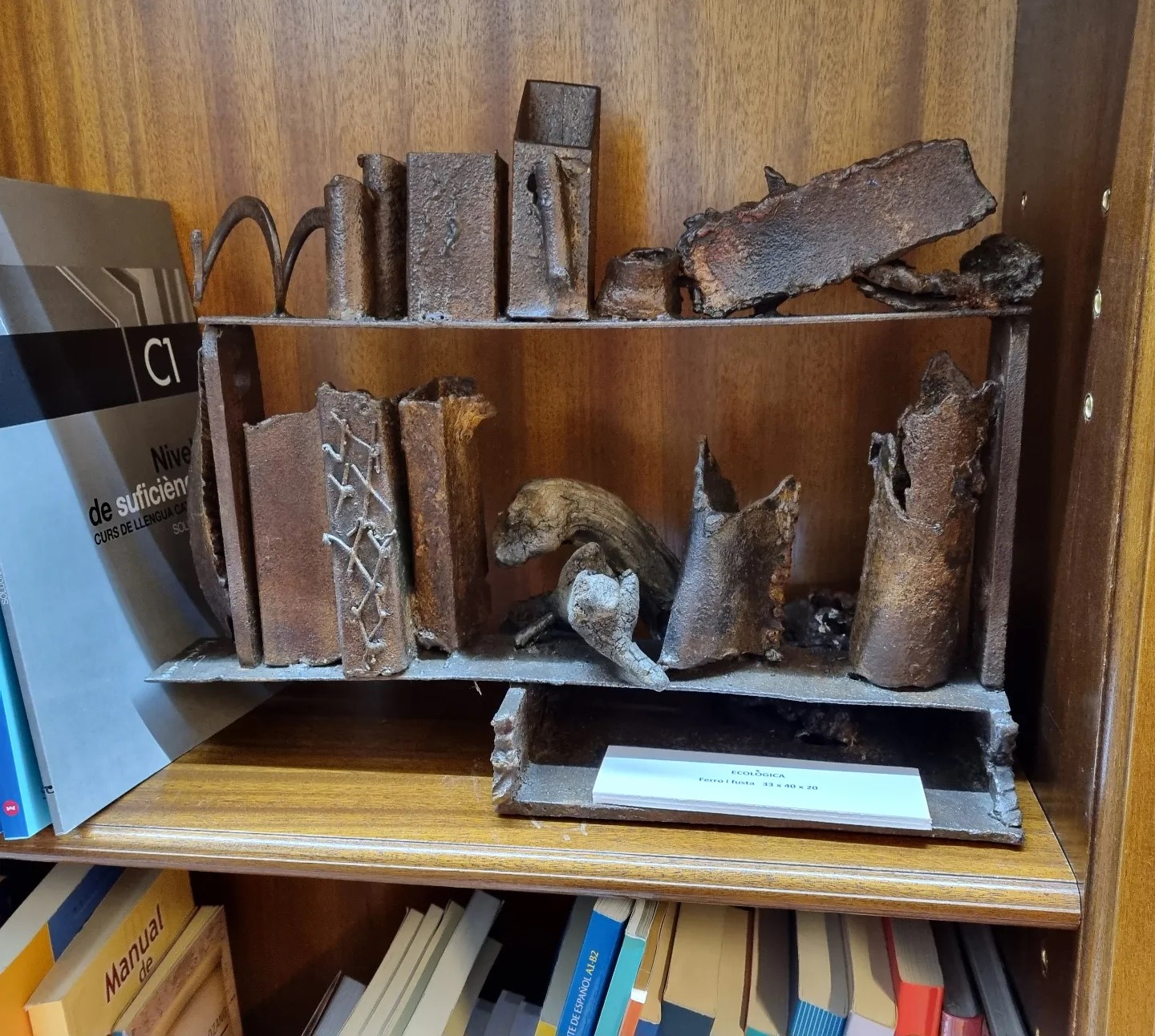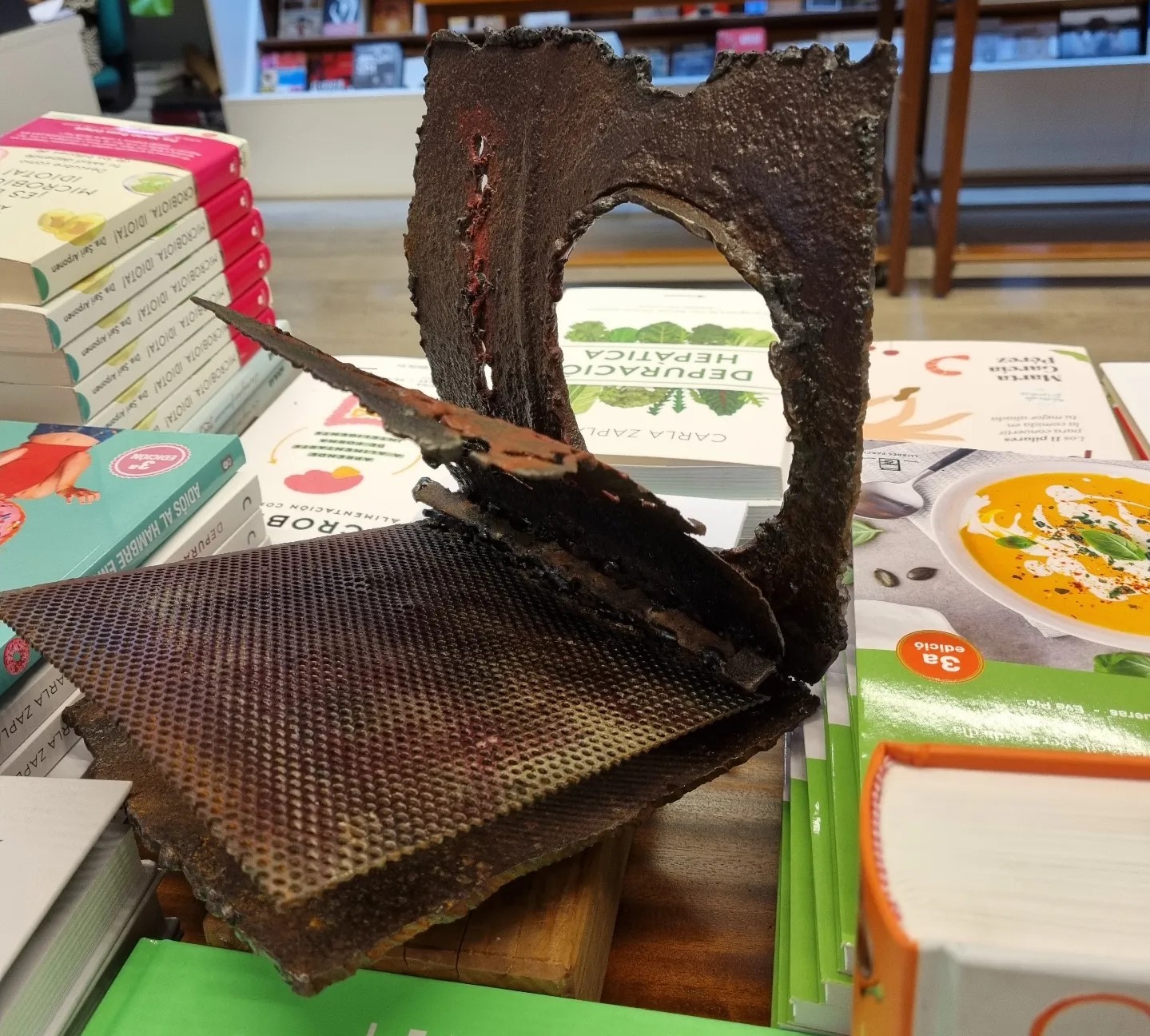 Ahir vam celebrar la inauguració de l’exposició de l’Àngels Freixanet, amb peces creades a partir de ferro reciclat i fusta. Figures artístiques envoltades de llibres, que, a la vegada, també ho són.