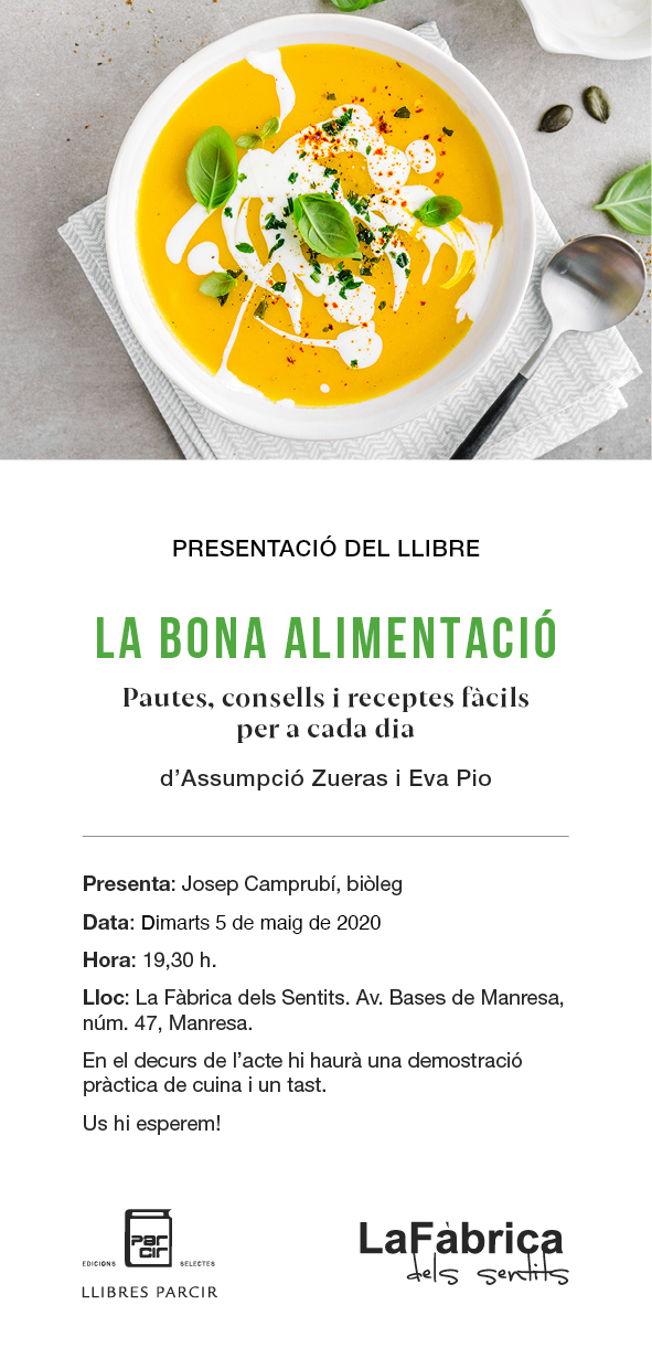 El dimarts 5 de maig, a partir de les 19,30 h. presentarem el nou llibre de l'Assumpció Zueras i l'Eva Pio, "LA BONA ALIMENTACIÓ. PAUTES, CONSELLS I RECEPTES FÀCILS PER A CADA DIA" (ed. Parcir Edicions Selectes). L'acte es farà a la Fàbrica dels Sentits, Av. Bases de Manresa, 47 de la nostra ciutat i el conduirà Josep Camprubí, biòleg. I es farà una demostració pràctica de cuina i un tast. Us hi esperem!