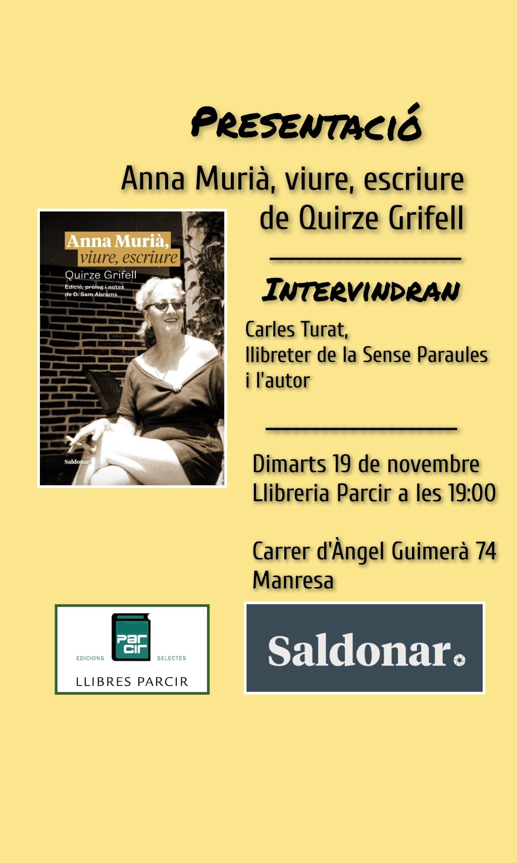 Us convidem a la presentació del llibre "Anna Murià, viure, escriure", de Quirze Grifell, editat per Saldonar. Es farà a la nostra llibreria el 19 de novembre de 2024 a les 19h. Intervindrà, a mes de l’autor, Carles Turat, llibreter de la Sense Paraules de Berga. Us hi esperem!