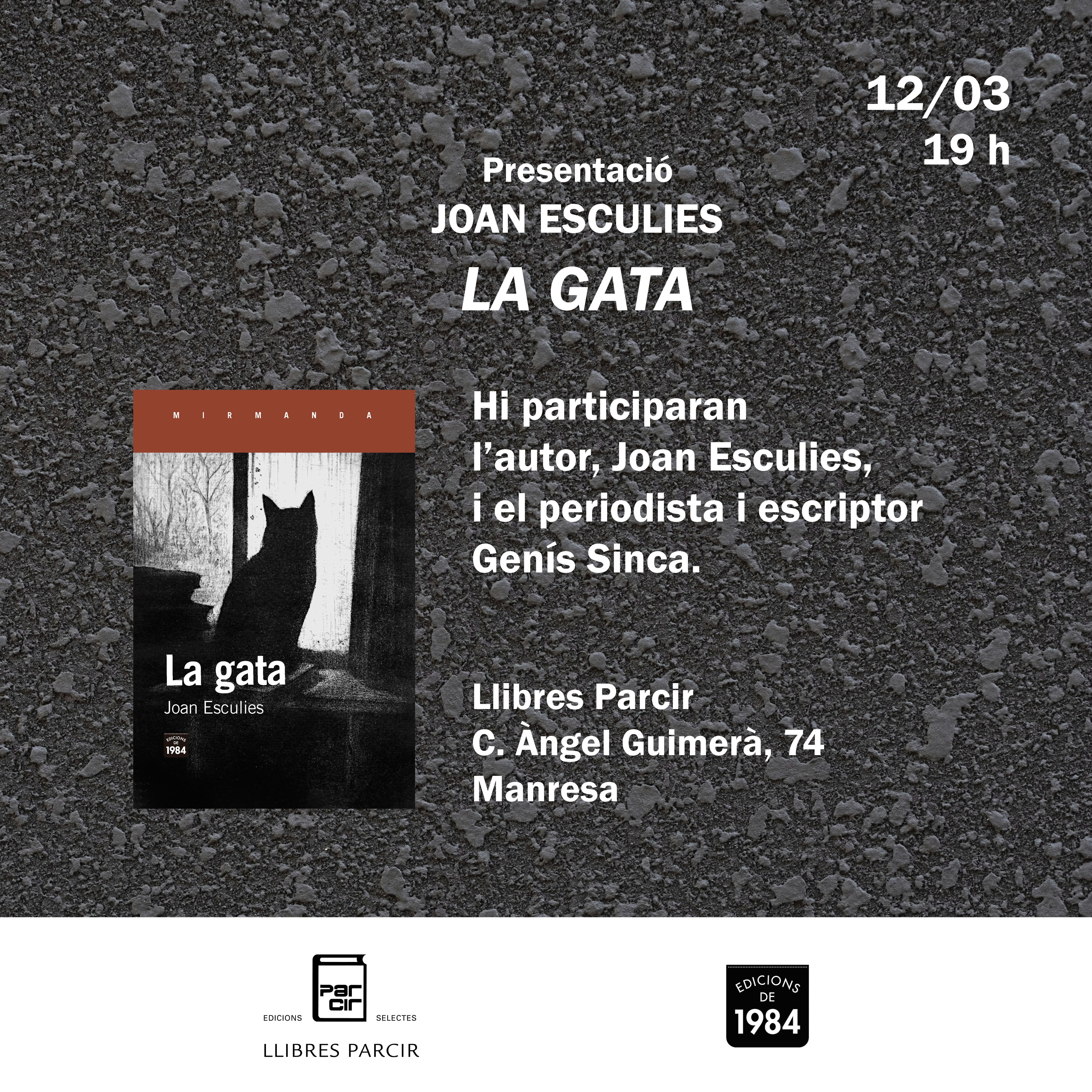 Us convidem a la presentació del llibre "La gata", de Joan Esculies. Es farà a la nostra llibreria el 12 de març de 2026 a les 19:00 h. Us hi esperem!