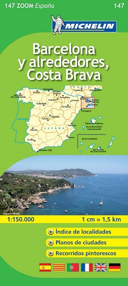 El Mapa Zoom Barcelona y alrededores, Costa Brava, editado a escala 1/150 000, presenta la leyenda en seis idiomas (castellano, portugués, catalán, alemán, francés e inglés), índice de localidades y contiene los planos de tanto de Barcelona como de Girona.