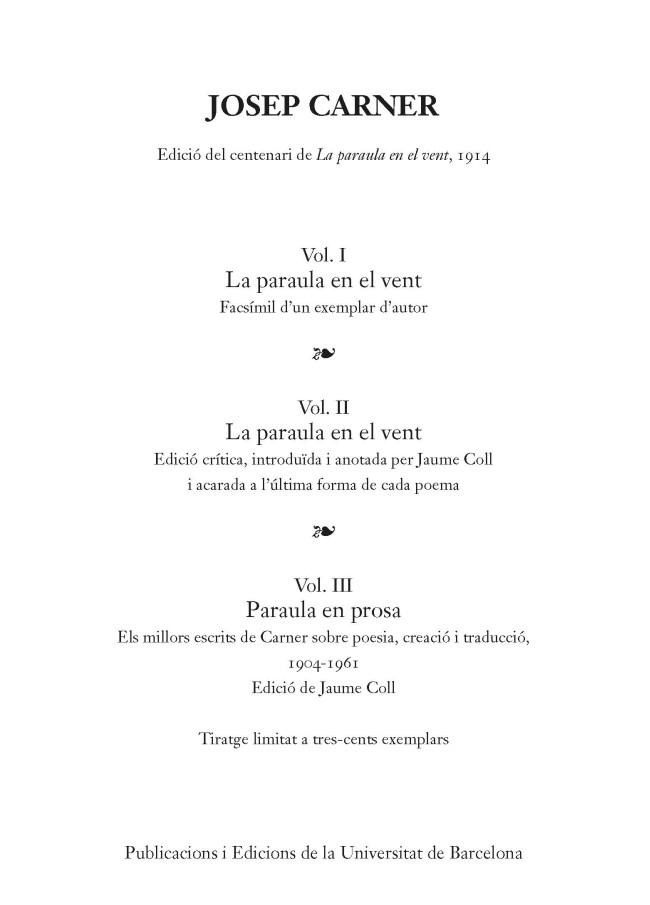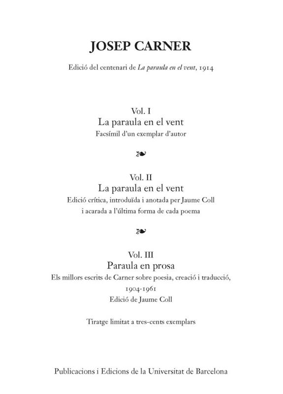 Els tres volums d?aquesta obra, presentats dins d?un estoig, celebren el centenari d?un títol cabdal, una vita nova de la poesia catalana moderna, La paraula en el vent [PaV 1914]. El primer és l?edició facsímil d?un exemplar únic, utilitzat pel poeta per revisar, de mà seva, els poemes de PaV que va incorporar a La inútil ofrena [InO 1924], vasta selecció de la seva poesia amorosa. En el facsímil, el lector trobarà la sincronia del text de 1914 i la diacronia manuscrita de trànsit cap al text de 1924.