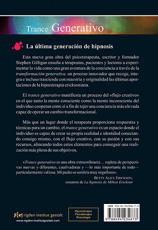 Esta nueva gran obra del psicoterapeuta, escritor y formador Stephen Gilligan enseña a terapeutas, pacientes y lectores a experimentar la vida como una gran aventura de la conciencia a través de la transformación generativa, un proceso innovador que recoge, integra e incluso trasciende con maestría y originalidad las últimas aportaciones de la hipnoterapia ericksoniana. El trance generativo manifiesta un proceso del «flujo creativo» en el que tanto la mente consciente como la mente inconsciente del individuo cooperan entre sí a fin de tejer una conciencia más elevada capaz de operar un cambio transformacional. Más que un lugar donde el terapeuta proporciona respuestas y técnicas para un cambio, el trance generativo es un espacio donde el individuo es capaz de crear su propia realidad e identidad conectando consigo mismo, con el flujo creativo, con su pasión y con sus recursos, alineando todos estos elementos para conseguir una realización más plena de sus objetivos.