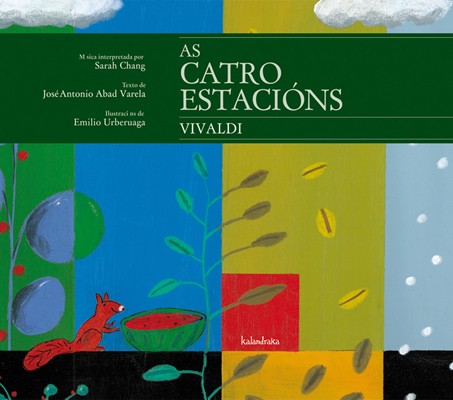 O esquío estaba marabillado. Correu dun lado para outro no céspede mol, gabeou polas árbores rozándose cos gromos e, dende o máis alto, chamou os demais esquíos: «Saíde, axiña, chegou a primavera»... ?As catro estacións?, de Antonio Vivaldi (Venecia, 1678-Viena, 1741), é unha das mellores composicións da música barroca. Precoz mestre de violín, o seu virtuoso creador chegou a compoñer 600 concertos, 100 óperas e numerosas pezas para instrumentos. Inspirándose nesta obra, José Antonio Abad presenta un relato bucólico ambientado nun bosque, onde describe os cambios estacionais: a primavera co seu traxe de flores, o sofocante calor do verán, a chegada do outono cando as árbores lle regalan ao vento a súa follaxe, e a choiva de confeti branco do inverno.