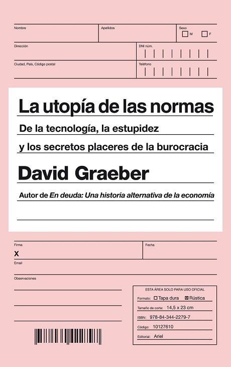¿Cuál es el origen de ese afán por regular, imponer normas y burocratizar todos y cada uno de los aspectos de nuestra vida? Y lo más importante, ¿hasta qué punto nos arruina la existencia toda esa cantidad de formularios, procedimientos y documentación? No sólo en lo público, también en el trabajo y en la vida privada. Para responder a estas preguntas, David Graeber, uno de los pensadores más provocadores e influyentes del momento, pone el foco sobre las distintas formas en que la burocracia se inmiscuye en nuestro día a día y revela hasta qué punto llega a determinar nuestras vidas. Un interminable y abominable papeleo que anula la creatividad y consume gran parte del tiempo. El avance tecnológico, la gran promesa del capitalismo, se ha descubierto como otro mecanismo más de control, mucho más poderoso, al que sin embargo nos hemos doblegado sin oponer resistencia, seducidos por sus encantos. Navegando desde el influjo de la economía liberal de la segunda mitad del siglo xx hasta el significado oculto tras personajes como James Bond, Sherlock Holmes o Batman, este libro es un notable trabajo de teoría social en la tradición de autores como Foucault, Marcuse o el mismo Marx, si bien la presencia en su análisis de la cultura popular y su accesibilidad lo acercan también a las obras de Zizek. Un libro imprescindible para los tiempos que vivimos, que nos arma de argumentos en el debate presente sobre el cambio de modelo y que nos señala el camino hacia un mundo mejor y más justo.