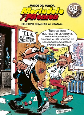 Número 190 de la colección «Magos del Humor». Objetivo eliminar al "Rana", originalmente publicado en 1976, llega ahora a la emblemática colección «Magos del Humor». Una aventura en la que Mortadelo y Filemón reciben la importante y peligrosa misión de acabar con el famoso delincuente, el «Rana». El jefe de la organización rival de la T.I.A., el H.I.G.O., apodado el «Rana», ha intentado liquidar al Súper, por lo que este le encarga a Mortadelo y Filemón que eliminen a su rival. Los agentes se introducirán en la organización enemiga, haciendo creer al «Rana» que se pasan a su bando. Con sus peculiares habilidades, intentarán acabar con el jefe del H.I.G.O. de mil maneras, pero... ¿lo conseguirán? Sobre la colección: La colección «Magos del Humor» nació en la editorial Bruguera en el año 1984 recuperando títulos que ya habían sido publicados en su antecesora «Ases del Humor» (1969). Debido al cierre de Bruguera en 1986, en esta etapa solo llegaron a ver la luz los primeros 12 volúmenes de la serie, pero en 1987 Ediciones B retomó la publicación de la colección desde su primer número hasta la actualidad. «Magos del Humor», con su formato coleccionista en tapa dura de 210 x 290 mm, es la colección en la que aparecen por primera vez las aventuras inéditas de Mortadelo y Filemón y de Superlópez, aunque también puede encontrarse material de grandes personajes de Bruguera como Zipi y Zape de Escobar, 13, Rue del Percebe, Pepe Gotera y Otilio, El botones Sacarino, La familia Trapisonda y Rompetechos de Ibáñez, Los cuentos de tío Vázquez o La familia Cebolleta de Manuel Vázquez, entre otros.