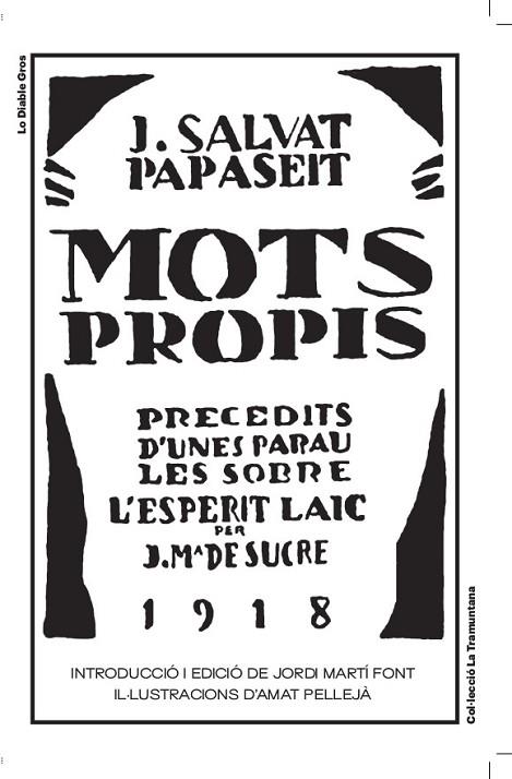 Amb el títol de Mots-propis, Salvat-Papasseit va publicar a Un Enemic del Poble un total de 118 textos en els tres anys que va sortir la revista, de 1917 a 1919. Però el llibre que els havia de recollir tots, malgrat comptar amb un pròleg de Josep M. De Sucre i una portada obra de Torres-García, no va arribar a sortir com a conseqüència de l?extrema pobresa en què vivia Salvat. Ell mateix va deixar escrit que va fer-ne dues correccions però que no va aconseguir reunir les diners per publicar-lo. L?any següent, sortiria el seu primer llibre de poemes i aquests textos aforístics de pensament no van ser publicats, tot i que no tots, fins que l?any 1975, J. M. Sobré en va recollir la majoria en un volum. L?any 2006, amb la publicació de l?obra completa de Salvat per part de Carme Arenas es van reunir tots i fa deu anys l?editorial Roure en va fer una primera edició completa tot i que difícil de trobar i que no incloïa cap explicació sobre què era aquell llibre. Ara, us presentem Mots-propis tal com el va pensar Salvat, amb un pròleg explicatiu de Jordi Martí Font i il·lustracions per a cada text d?Amat Pellejà.