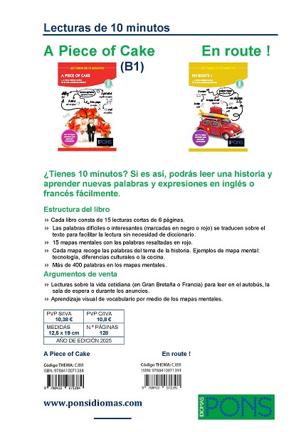 Consta de 15 lecturas cortas de 6 páginas.La palabras difíciles o interesantes (marcadas en negro o rojo) se traducen sobre el texto para facilitar la lectura sin necesidad de diccionario.15 mapas mentales con las palabras resaltadas en rojo.Cada mapa recoge las palabras del tema de la historia. Eje...