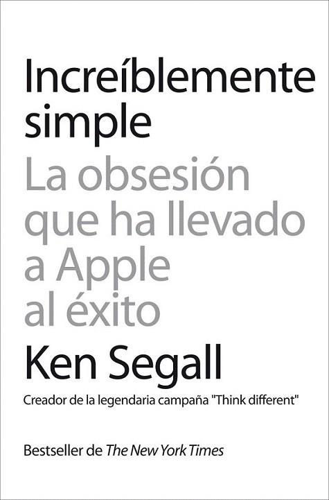 En Increíblemente simple descubrirá el arte de la sencillez que predicaba el fundador de Apple Steve Jobs y del que es partícipe el autor de este libro, Ken Segall, creador de la campaña publicitaria más recordada de Apple, la icónica "Think different". Con este libro aprenderá la filosofía del:• Think minimal (pensar en mínimo): reducir las opciones al mínimo aporta claridad a una compañía y a sus clientes, tal como Jobs demostró cuando reemplazó más de veinte modelos de producto por una línea de cuatro. • Think small (pensar en pequeño): optar por grupos reducidos de empleados inteligentes para organizar proyectos motiva a los trabajadores y aumenta su productividad.• Think in motion (pensar en movimiento): hacer que los equipos de proyectos estén en constante actividad focaliza el pensamiento creativo en objetivos bien definidos y minimiza las distracciones.• Think iconic (pensar conceptualmente): utilizar una imagen simple y potente para simbolizar el beneficio de un producto o de una idea crea un recuerdo mucho más profundo en la mente del consumidor.• Think war (pensar beligerantemente): practicar la competencia desleal y utilizar todas las armas a su disposición es la mejor forma de asegurarse de que las ideas sobrevivirán indemnes.En definitiva, en esta obra Segall describe la obsesión de Apple por la simplicidad a través de histroias personales fascinantes y nunca antes contadas.Gracias a su ingenio y su perspicacia descubrirá cómo las compañías que aprovechan el poder de lo simple pueden destacar frente a sus competidores, y cómo las personas que lo dominen pueden convertirse en activos fundamentales para sus organizaciones.