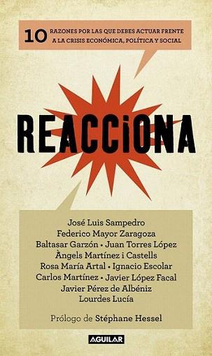 Reacciona trata de clarificar y encauzar la pesadumbre de un sector creciente de la sociedad española con la crisis económica, política y social que estamos viviendo, con la crisis del sistema. Y varios factores están en juego: nuestra estabilidad, el equilibrio global, una generación de jóvenes sin futuro y el futuro mismo. Una mezcla singular de especialistas, un comité de sabios, entre los que destacan José Luis Sampedro o Baltasar Garzón, que nos brinda diez respuestas con una idea común: la necesidad de tomar postura y actuar, de concienciarnos y despertar pues todavía hay esperanza, hay soluciones. Una ciudadanía informada y responsable puede impedir los atropellos. Todos con un mismo rumbo, con un objetivo claro: defender la dignidad, la democracia y el bien común. Ha llegado el momento. El primer paso es reaccionar.