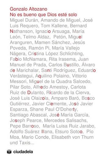 Todos ellos desfilan por No es bueno que Dios esté solo, libro compuesto por las entrevistas publicadas en la contraportada de Alba durante los años de plomo del zapaterato (de ahí que tengan un añadido valor testimonial). En ningún momento el autor trató de someter a los entrevistados a un tercer grado acerca de su santidad, en todo caso enmendar la plana a los ingleses, que dicen que hablar de Dios no es de buena educación.