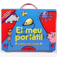 Capsa en forma d'ordinador portàtil amb 24 llibrets amb noms d'animals i una pantalla reutilitzable.